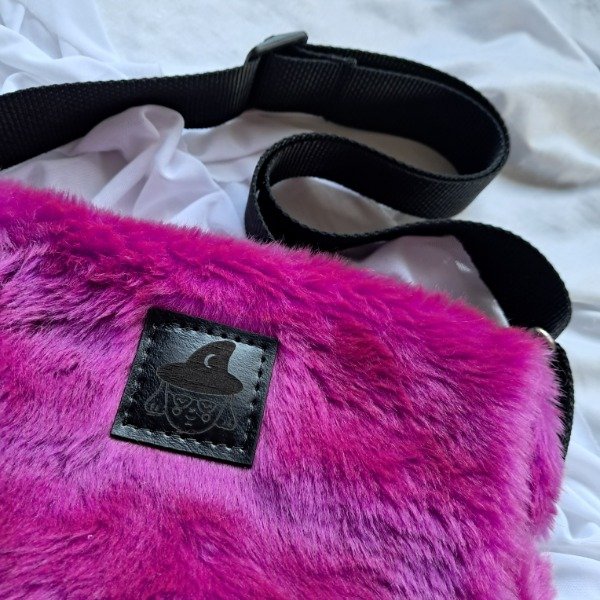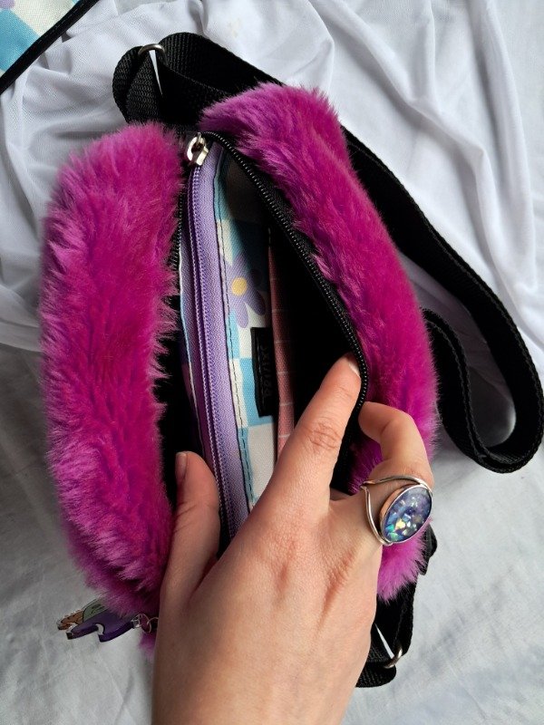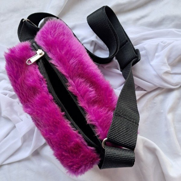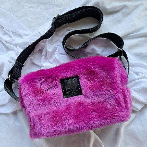 Cartera suave confeccionada con peluche y tela impermeable por dentro. Posee cintas regulables de 1,50 CM para usarla al hombro o cruzada tipo morral.