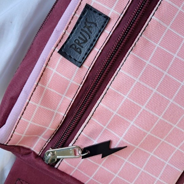 Posee doble cierre, bolsillo frontal, compartimento principal y bolsillo en el interior.
